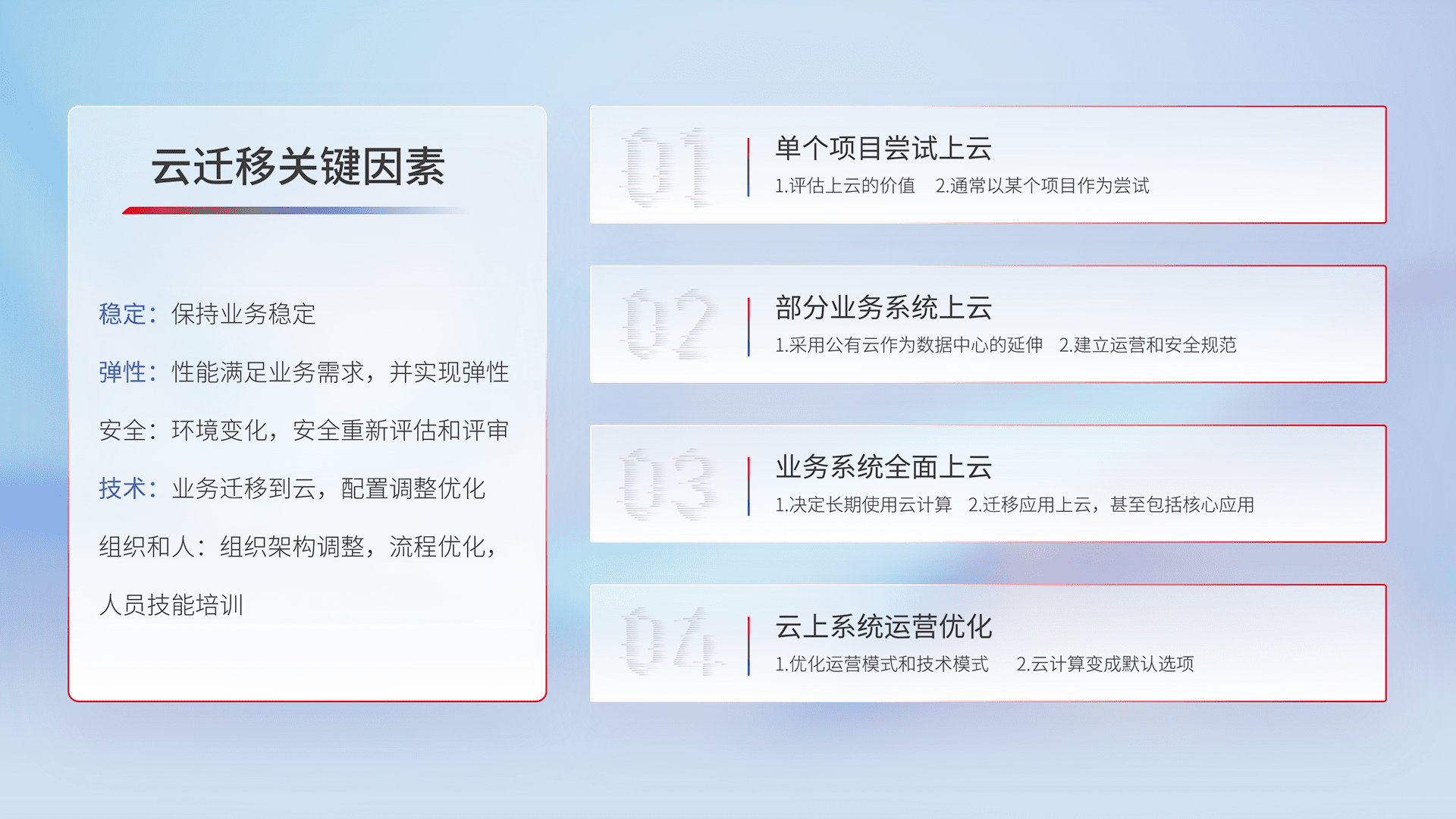 结合实际业务,,从规划设计、、云平台选型、、、、云原生改造、、数据迁移、、、、集成交付,,,迁移全过程为客户识别最佳上云路径,,,,做好风险识别管理,,,,设计网络架构、、身份权限、、安全审计合规、、、操作审计、、、日志审计、、监控告警策略、、、、多站点容灾设计等,,对云上基础设施进行整体规划,,提升IT治理水平,,以满足弹性、、高可用、、、高性能的需求。。