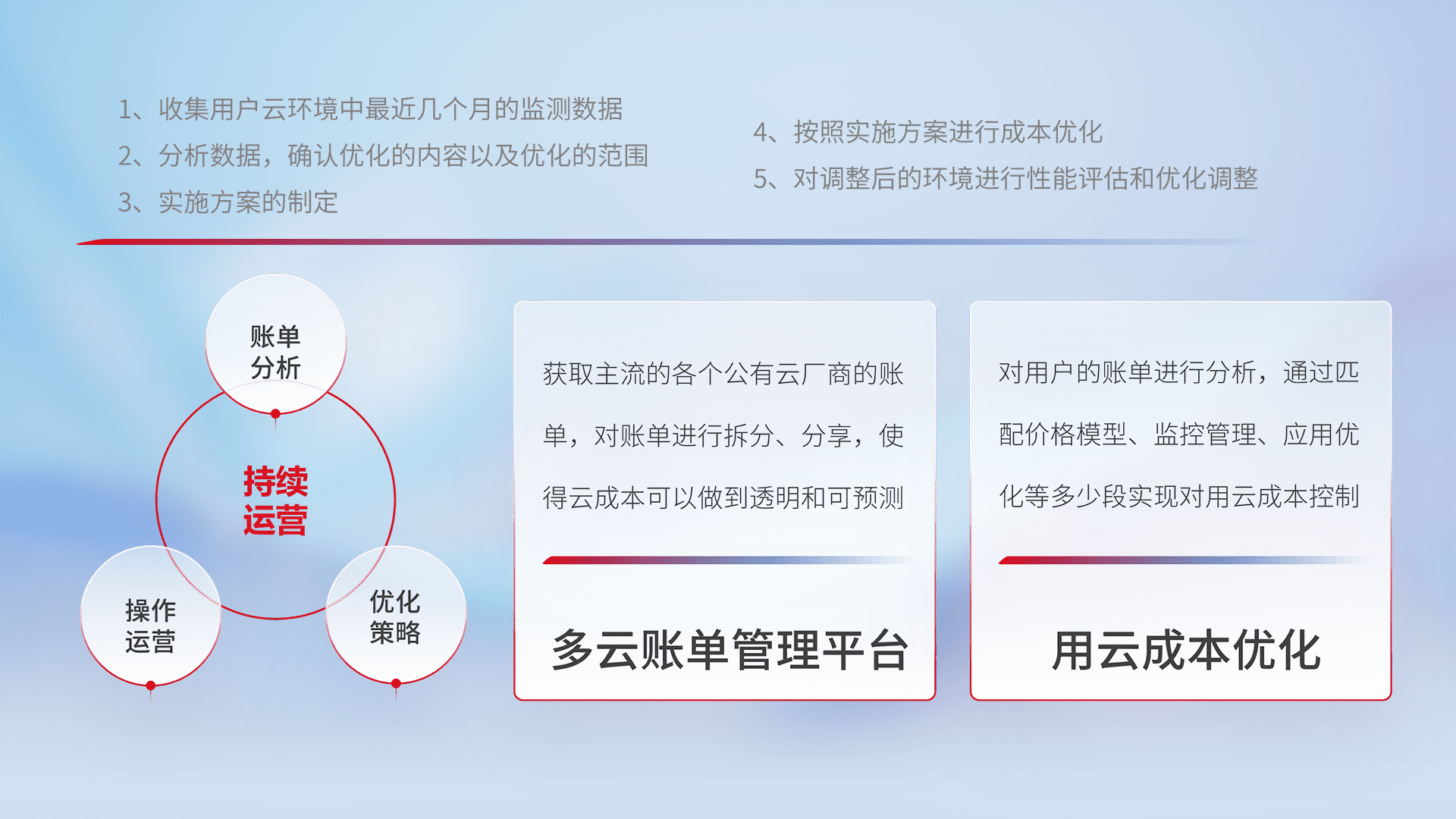 通过多云纳管,,,以统一的资源数据模型把客户的云资源进行抽象和封装,,进而实现对多云资源的统一操作,,保障云资源管理的可靠性、、、稳定性与可用性。。。量身定制化运维内容,,配置、、、、开发运维、、、、补丁管理、、、备份、、监控、、、认证和访问管理、、审计和日常巡检等,,保障在用云过程中的可靠度,,稳定度以及高可用率。。。
