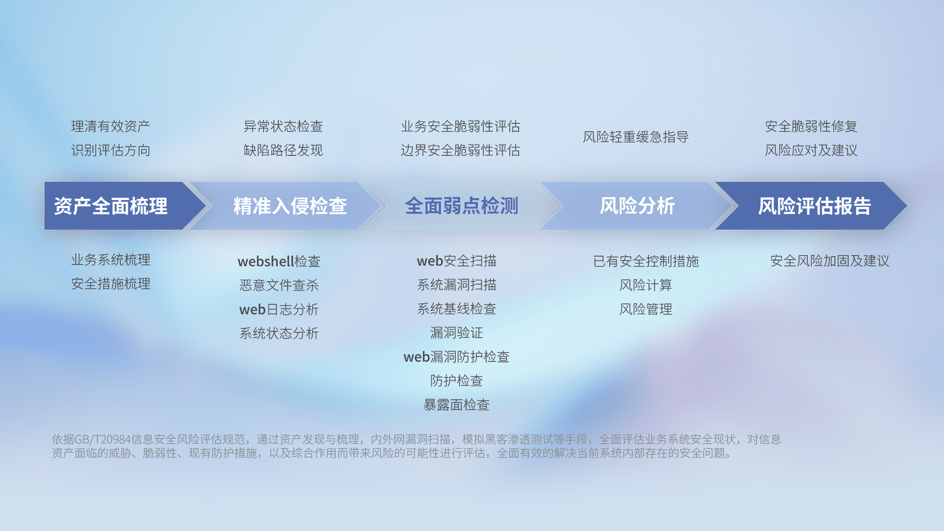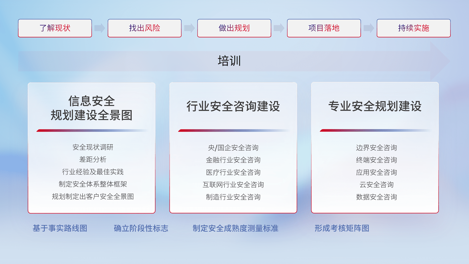 针对客户行业特性,,,,以专业的安全服务+多厂商联合解决方案提供专属的一站式安全管理服务,,,,帮助客户全面感知网络空间威胁,,,基于识别、、检测、、分析、、、、防护、、监测、、、、响应的服务理论模型,,从方案咨询、、集成交付、、、评估验证、、优化加固、、、、运维运营,,,致力于为客户提供完整的闭环管理式安全服务。。。以实战经验为客户打造高抵御风险的安全体系,,帮助客户发现威胁、、对抗威胁、、、处置威胁,,,,不断积累安全对抗能力,,,持续保障数字化安全。。